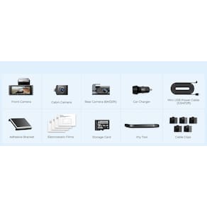 Itens inclusos: 1 Câmera frontal 4K 1 Câmera interna full HD 1 Câmera Traseira full HD 1 Cabo de alimentação (liga no acendedor do veículo) 1 Cartão de memória de 64gb 1 Suporte para fixação da câmera traseira 1 Adesivo para fixação da câmera frontal 1 Manual de instrução. Ean: 6973888261532