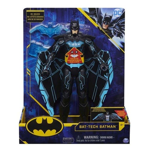 Leve suas aventuras com o Batman para outro nível com a figura de ação Bat-Tech Batman Deluxe de 30 cm! O boneco conta com asas expansíveis, luzes, mais de 20 sons e dois acessórios translúcidos: um blaster e um batarang. Pressione o símbolo no peito para ativar as luzes e os sons — quando acionado, o acessório na mão direita também se ilumina.