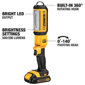 DEWALT Lanterna LED DCL050 e Cabeça Pivotante DCL043 3 Áreas de trabalho iluminadas do local de trabalho escuro do LED Brilhante 2 Configurações de brilho de 500 lúmens e 250 lúmens de flexibilidade para uma iluminação ou tempo de operação. pivotante de 140 opções de versatilidade para superfícies de trabalho de iluminação. A tensão inicial máxima da bateria medida sem carga de trabalho é de 20 volts Tensão nominal é 18. 3 LEDs brilhantes para áreas de trabalho escuras. Configurações de brilho, 500 e 250 Lumens. Cabeça pivotante de 140 graus. Construído em modelo0 e 36Degree. Tampa de lente moldada Marca: Não Informado