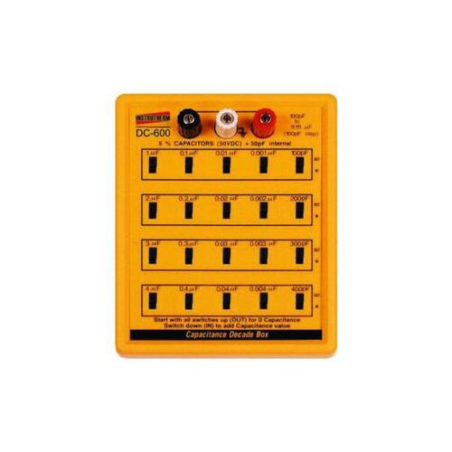DÉCADA CAPACITIVA MOD. DC-600, FAIXA DE MEDIÇÃO DE 100PF A 11,111?F DESCRIÇÃO: Década capacitiva mod. dc-600, faixa de medição de 100pf a 11,111?f ESPECIFICAÇÕES TÉCNICAS: Escala: 100pF para 11,111mF (100pF por passo) Precisão: Capacitores 5%, utilizado inteiramente. < 1mF, freqüência de teste de 1KHz ³ 1mF, freqüência de teste de 100Hz Limite de tensão: 50V DC, capacitores não-polarizados Capacitância Interna Perdida: Máx. 50pF Alimentação: Nenhuma Temperatura de Operação: 0 a 50ºC (32 a 122ºF) Umidade de Operação: Menor que 80% UR Dimensões / Peso: 147 x 117 x 33mm / 304g. ACESSÓRIOS FORNECIDOS: Manual de instruções