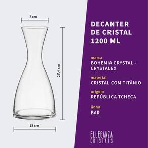 Decanter de cristal ecológico tipo jarra 1200 ml da linha bar bohemia crystal resistência titânio e cristal ecológico detalhes do produtomaterial: cristal com titânio, mais resistente que o cristal comumorigem: produto da república tchecaproduto: decanter de cristal quantidade: 01 peçacapacidade: 1200 mltamanho: 27,4 cm de altura, 8 cm de diâmetro de bocal e 13 cm de diâmetro de basemarca: bohemia crystallinha: barembalagem: caixas do fabricante, desenvolvidas especialmente para suportar cada modelo e mantê-las intactas no transporte. enviopostamos nossos produtos nos correios de 01 a 02 após a compra. todos os nossos produtos acompanham a impressa. trocas e devoluçõesseguimos todas as normas vigentes no código de defesa do consumidor.Adicionalmente, trocamos produtos danificados no transporte. informações relevantesa elleganza cristais comercializa produtos com preços excepcionalmente abaixo do mercado com qualidade assegurada pela marca tcheca bohemia crystal, que traduz em produtos belos e finos, anos de pesquisa e desenvolvimento de produto para oferecer em mais de 100 países, cristal de primeira qualidade, livre de Cinza e com design e transparência incríveis. 1 mas cristal não quebra facilmenteNão. O cristal com titânio é muito mais resistente a impactos e mudanças de temperatura se comparado ao cristal comum, proporcionando maior segurança e comodidade no manuseio. A elleganza cristais trabalha apenas com produtos contendo titânio em sua composição, trazendo excelência e qualidade a preços imbatíveis. 2 como substituir vidros diversos por cristal ecológico sem gastar muitoConte conosco, compre conosco e tenha acesso a um produto de cristal de marca exclusiva, da europa, e com preço de vidro comum. Compare nossos preços e veja que nos comprometemos a valorizar nossos clientes no preço e atendimento. sobre a bohemia crystala bohemia crystal é líder global no mercado de cristais, com atuação em mais de 100 países. Fabrica seus produtos na república tcheca, realiza altos investimentos no desenvolvimento e melhoramento de seus produtos para garantir-lhes qualidade de ponta e ser referência global de qualidade e sofisticação. Eles foram os precursores do movimento que tornou o cristal um material ecológico, sem Cinza em sua composição. Também se destacam de outras marcas ao adicionar titânio para seus produtos mais especiais e assegurar resistência muito superior ao cristal comum. A marca oferece aos seus clientes uma vasta gama de produtos, desde utensílios domésticos a itens para indústria química. Cada linha de produto tem sua embalagem personalizada de acordo com suas características e tamanho. Marca: Não Informado