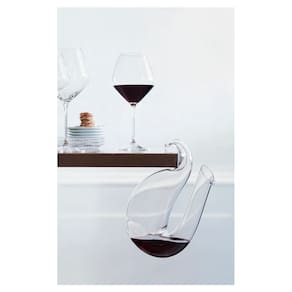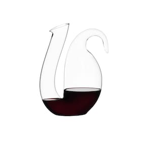 Formado livremente à mão, o decanter apresenta boca larga tanto para receber quanto para servir o vinho, abrindo-se em uma base mais larga para permitir o livre fluxo de troca de ar com o vinho. Uma ponta cônica e enrolada adiciona um segundo nível de funcionalidade ao Ayam, atuando como uma alça elegante.