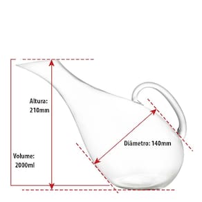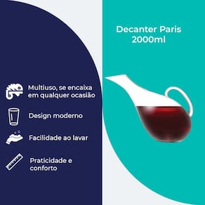 O Decanter Paris 2L é ideal para quem valoriza vinho com estilo e técnica. Feito em vidro de alta transparência, tem design moderno e acabamento refinado que realça a apresentação do vinho. Sua capacidade de 2 litros permite a oxigenação ideal, liberando aromas e sabores com mais intensidade. Seu grande diferencial é a alça ergonômica, que garante segurança e conforto ao servir. Além de facilitar o manuseio, mesmo com o Decanter cheio, a alça funciona como um Suporte para vinho, tornando o serviço mais prático e elegante. O bico inclinado proporciona controle total do fluxo e evita gotejamentos.