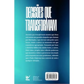Decisões que transformam mostra que Deus está atento aos gemidos daqueles que clamam por libertação, e que ele tem todo poder para livrar, remir e salvar no momento em que considerar apropriado. Tomando por base a história bíblica da rainha Ester, o autor, Eliel Lima, propõe uma reflexão poderosa que incentiva o leitor a perseverar em oração pela resposta aos seus problemas, sabendo que o Todo-Poderoso tem controle de toda e qualquer situação.
