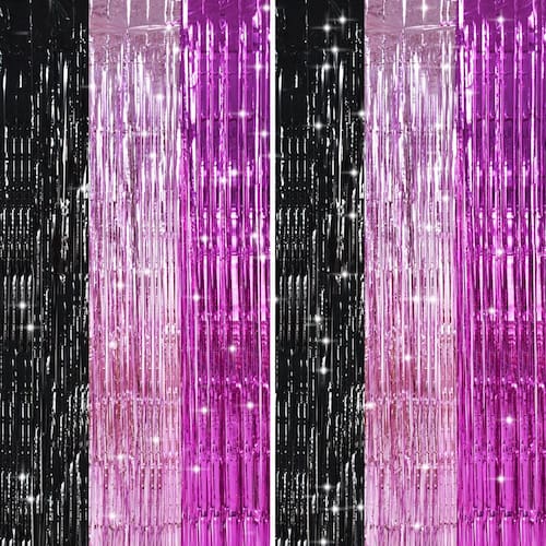 Flâmulas de porta TONIFUL, rosa choque, fundo de cabine fotográfica em preto e rosa, flâmulas metálicas, cortina com franjas metálicas para aniversário, ano novo, formatura, formatura, chá de bebê, festa de chá de bebê, decoração de flâmulas