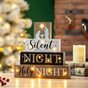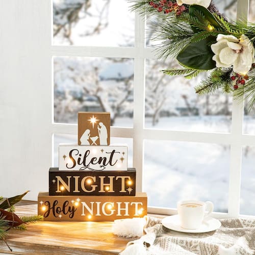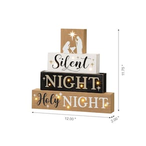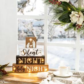 Bloco de madeira de Natal - MATERIAL E DIMENSÃO - Este lindo conjunto de blocos de madeira é feito de MDF, é durável e resistente. O conjunto consiste em 4 peças de blocos de madeira com letras "Silent Night Holy Night" e 13 luzes brancas quentes de LED e 0,06 W cada luz, medindo 30 cm L x 5 cm P x 30 cm A. - Design fofo e rústico – os blocos são habilmente trabalhados à mão, começando com o corte do MDF no tamanho, lixando as matérias-primas e pintando a base à mão. Compartilhe suas crenças religiosas por uma mesa de deck com este bloco. A luz suave traz calor à sua casa à noite. A composição engenhosa de Jesus e as palavras criam uma atmosfera especial para suas férias. É sagrado e solene para suas celebrações de Natal. Um design de madeira envelhecida aplicado transforma uma matéria-prima em uma obra de arte. - Decoração perfeita: esta placa de madeira vintage é cortada com precisão, emoldurada, pintada, adiciona um toque atraente à sua casa, elegante, decorativa e prática, é uma ótima decoração para sua sala de estar, sala de jantar, quarto, jardim e qualquer superfície plana. - Versátil – As placas de madeira têm um acabamento envelhecido e rústico, se encaixam perfeitamente com mesa, lareira, cornija, janela, prateleiras e mesa de escritório. Pode ficar em pé livremente sobre a mesa e as luzes são operadas por bateria, que pode se iluminar com luz quente. Requer 2 pilhas AAA (não incluídas). - Escolha de presente ideal – o design fofo e temático de festival o torna o presente perfeito para seus amigos e familiares no Natal, inverno, Ação de Graças e inauguração de casa. Crianças e adultos vão adorar.