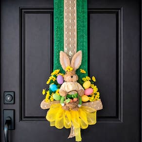 Deixe sua entrada ainda mais encantadora nesta Páscoa com este lindo escapulário decorativo para porta, com coelha, cesta e ovos. Um enfeite vertical elegante que traz o clima alegre e acolhedor da Páscoa logo na chegada ao ambiente