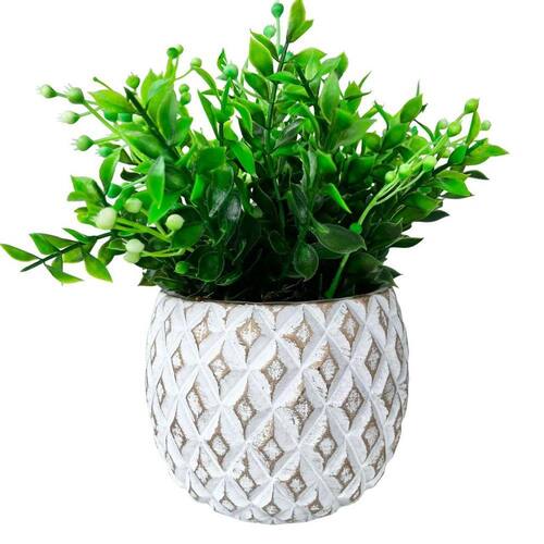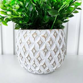 Decoração rústica sala quarto vaso cachepot artesanal médio branco/dourado de cimento com textura trabalhada em 3D triângulo.