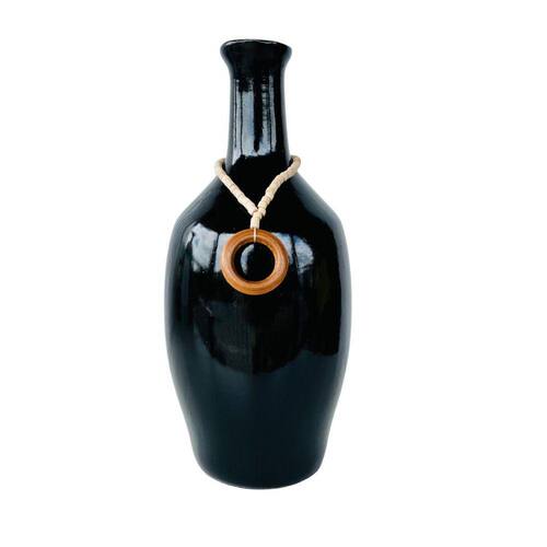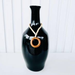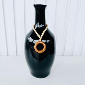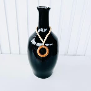 Decoração sala rack aparador vaso garrafa de cerâmica moderno liso na cor preto brilho com detalhe pingente de madeira.