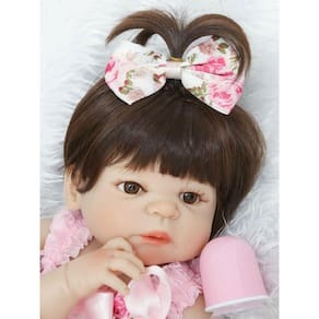 Estrutura: Todo o corpo é feito de Vinil 100% Silicone super macio; ela pode sentar-se ou deitar, não pode falar, não come, pode dar banho, movimenta braços e pernas, olhos não piscam;