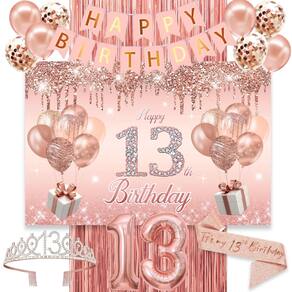 Decorações de aniversário para meninas — banner de festa em ouro rosa, balão de feliz aniversário, decorações de festa — 🎉 O QUE VOCÊ GANHA — Decorações de 13º aniversário com tema de ouro rosa, incluindo pano de fundo de 13º aniversário em ouro rosa de 40" com o número 13,1 unidades de banner de feliz aniversário, 1 peça de cortina com franjas em ouro rosa, 8 peças de balões de ouro rosa, tiara/coroa brilhante de 13º aniversário, faixa “É meu 13º aniversário”, eles são primorosamente embalados na caixa. - 🎉 PANO DE FUNDO DO 13º ANIVERSÁRIO - O banner do 13º aniversário vem com um rolo de corda que permite que você passe a corda pelos quatro cantos do banner. Em seguida, pendure-a na árvore, na parede e em qualquer lugar que você quiser. Este cenário de festa é um ótimo complemento para uma festa temática de aniversário, incrível para melhorar a atmosfera da festa de aniversário. Sua festa de aniversário será um evento impressionante - 🎉 GLITTERY ROSE GOLD CROWN 13 - Feita de liga e strass de alta qualidade. A tiara de 13º aniversário vem com pentes que garantem que ela agarre o cabelo com mais firmeza para caber em meninas. Dimensão: 5,4” na parte frontal. Nossa faixa de 13º aniversário é feita de tecido brilhante de alta qualidade com a inscrição “É meu 13º aniversário” em papel alumínio. A faixa tem 63 polegadas de comprimento e vem com um alfinete dourado que você pode ajustar facilmente o comprimento necessário. - 🎉 DECORAÇÕES DE 13º ANIVERSÁRIO — Podem ser aplicadas em eventos internos ou externos, use-as para criar um evento memorável e promover uma atmosfera feliz para seus amigos e familiares, ótima solução de planejamento de festas para muitos eventos significativos. Vale a pena preparar uma festa de 13º aniversário distinta para você ou sua família. Além disso, cada conjunto de decorações de 13º aniversário foi cuidadosamente inspecionado para garantir uma decoração de 13º aniversário satisfatória para ela ou ele. - 🎉 FESTA INESQUECÍVEL — Nosso banner e balões de 13º aniversário são ótimas decorações para a festa de 13º aniversário. Decorações de festa em ouro rosa, são perfeitas para pendurar na parede, janela, quintal ou em qualquer lugar que você queira decorar. Adequado para festas internas, além de festas ao ar livre. Também pode ser utilizado como toalha de mesa de festa e pano de fundo para cabines de fotos, crie um cenário de festa chique para tornar sua festa mais atraente e hospede uma festa de aniversário inesquecível