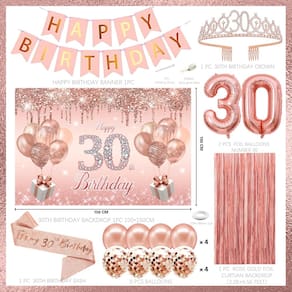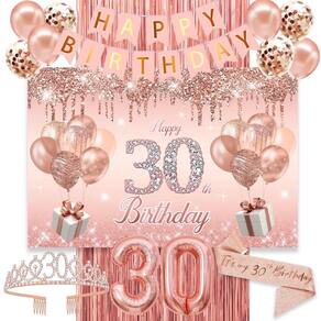 Decorações de aniversário para meninas — banner de festa em ouro rosa, balão de feliz aniversário, decorações de festa — 🎉 O QUE VOCÊ GANHA — Decorações de 30 anos com tema de ouro rosa, incluindo pano de fundo de 30 anos em ouro rosa de 40" do número 30,1 unidade de banner de feliz aniversário com alfinetes, 1 peça de cortina com franjas em ouro rosa, 8 peças de balões de ouro rosa, tiara/coroa brilhante de 30º aniversário, “É meu 30º aniversário” Ah, eles são primorosamente embalados na caixa. - 🎉 PANO DE FUNDO DO 30º ANIVERSÁRIO - O banner do 30º aniversário vem com um rolo de corda que permite que você passe a corda pelos quatro cantos do banner. Em seguida, pendure-a na árvore, na parede e em qualquer lugar que você quiser. Este cenário de festa é um ótimo complemento para uma festa temática de aniversário, incrível para melhorar a atmosfera da festa de aniversário. Sua festa de aniversário será um evento impressionante - 🎉 GLITTERY ROSE GOLD CROWN 30 - Feita de liga e strass de alta qualidade. A tiara de 30 anos vem com pentes que garantem que ela agarre o cabelo com mais firmeza para caber em meninas. Dimensão: 5,4” na parte frontal. Nossa faixa de aniversário de 30 anos é feita de tecido brilhante de alta qualidade com a inscrição “É meu aniversário de 30 anos” em papel alumínio. A faixa tem 63 polegadas de comprimento e vem com um alfinete dourado que você pode ajustar facilmente o comprimento necessário. - 🎉 DECORAÇÕES DE 30º ANIVERSÁRIO — Podem ser aplicadas em eventos internos ou externos, use-as para criar um evento memorável e promover uma atmosfera feliz para seus amigos e familiares, ótima solução de planejamento de festas para muitos eventos significativos. Vale a pena preparar uma festa de 30 anos distinta para você ou sua família. Além disso, cada conjunto de decorações de 30º aniversário foi cuidadosamente inspecionado para garantir uma decoração satisfatória de 30º aniversário para ela ou ele. - 🎉 FESTA INESQUECÍVEL — Nosso banner e balões de 30º aniversário são ótimas decorações para a festa de 30º aniversário. Decorações de festa em ouro rosa, são perfeitas para pendurar na parede, janela, quintal ou em qualquer lugar que você queira decorar. Adequado para festas internas, além de festas ao ar livre. Também pode ser utilizado como toalha de mesa de festa e pano de fundo para cabines de fotos, crie um cenário de festa chique para tornar sua festa mais atraente e hospede uma festa de aniversário inesquecível