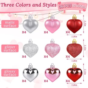 Decorações de Dia dos Namorados Ornamentos de coração Ornamentos de Dia dos Namorados para árvore - Estilo e quantidade: Você receberá 36 enfeites em forma de coração em três cores (ornamentos de coração vermelho, ornamentos rosa, ornamentos de prata) com três superfícies brilhantes, foscas e brilhantes. Cada decoração de dia dos namorados mede 4,6 x 5,6 cm - Decorações românticas para o dia dos namorados: estes enfeites de coração para o Dia dos Namorados são feitos de plástico de alta qualidade, leves, coloridos e podem ser reutilizados todos os anos. Adicionando uma atmosfera mais doce a dias importantes, adicione cor aos seus festivais e eventos - Fácil de pendurar: cada enfeite de árvore de dia dos namorados tem uma corda dourada na parte superior, que pode ser facilmente pendurada em vários lugares que você deseja decorar: árvores, janelas, maçanetas, etc., criando uma atmosfera romântica e conveniente para você. Os enfeites de árvore dos namorados são muito atraentes e trazem surpresas para sua amada - Amplamente aplicável: estes enfeites de dia dos namorados para árvore são requintadamente projetados com correspondência de cores que se adaptam à estética moderna e podem decorar sua casa muito bem. Adequado para cenas românticas como Dia dos Namorados, casamentos, aniversários, propostas - Conjunto de decoração valioso em forma de coração: estes enfeites de coração de Dia dos Namorados têm estilos bonitos e quantidades abundantes, o que os torna a decoração ideal para o seu Dia dos Namorados. Eles são bonitos e divertidos, decore-os para o efeito que você quiser