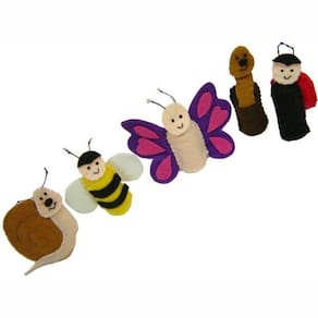 Esse kit conta com 5 personagens: Caracol, Abelha, Borboleta, Minhoca e Joaninha. As crianças podem criar suas próprias histórias e misturar os personagens para soltar a imaginação. Cada dedoche possui aproximadamente 5x10 cm e é acondicionado em uma embalagem plástica de 20x30 cm.