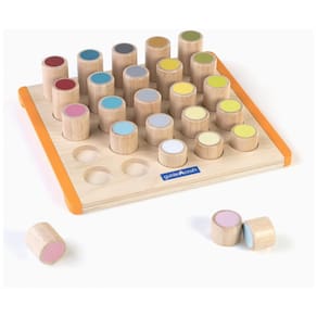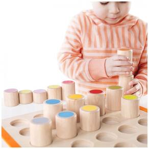 Peças cilíndricas em borracha maciça com impressões em tela para diferenciação por cor e forma, montadas em base de compensado de bétula com alças laterais de plástico macio para mobilidade facilitada. Estrutura reforçada para uso repetido, focada em identificação de formas e organização sequencial. Peso aproximado de 1,8 kg, embalagem compacta compatível com armazenamento em prateleiras padrão.?
