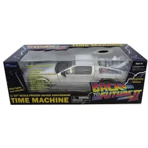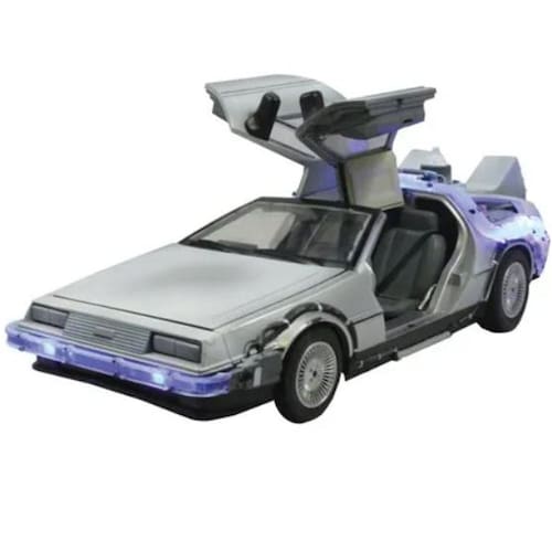 DELOREAN 2 ESCALA: 1/15 O carro possui sons do DeLorean do filme que incluem: - Primeira Viagem no Tempo - Problema do carro - Acelerando e descanso - Porta de abertura - Rev acima e Peel fora - Motor de arranque - Retorno da viagem no tempo - Retorno da viagem no tempo a um ponto insuportável - Time Circuit Engaged - Patamar Hover componentes de luz-up, incluindo prazos de bobinas, capacitor de fluxo, circuitos de tempo e Sr. Fusão rodas de rolamento, abre as portas de asa de gaivota e capô.