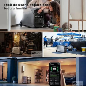 Conta com múltiplas saídas, incluindo AC bivolt (110V e 220V), USB-A, USB-C e DC. O equipamento é carregado na voltagem escolhida pelo cliente no momento da compra (127V ou 220V, não é bivolt no carregamento).