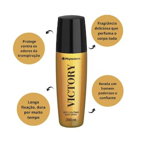 O Body Spray Victory de Phytoderm além de perfumar o corpo todo, ainda tem ação desodorante que que protege contra os odores da transpiração. A fragrância tem saída refrescante da menta, que se une às notas marcantes da canela e da flor de laranjeira e ao fundo sedutor da vanilla e das madeiras nobres. Victory revela um homem poderoso e confiante.