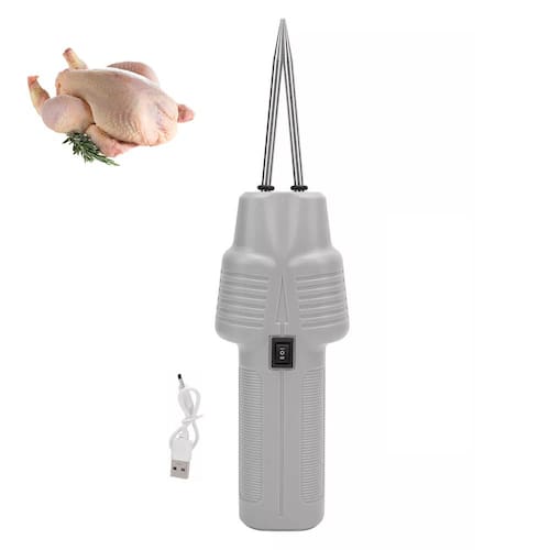 É portátil, possui cabeçote de alta fricção, ajuste automático de aperto, rotação de alta velocidade, depenagem rápida, sem danos à carne.