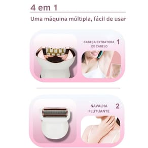 Removedor de Pelos de Alta Precisão: Com tecnologia micro pinça, remove até os pelos mais finos (2mm) com facilidade, garantindo uma pele com toque suave e macio. Aparador Suave: Ideal para uma remoção de pelos rápida e eficiente em pernas e corpo, adaptando-se delicadamente às suas curvas. Escova de Limpeza Facial: Com 10.000 cerdas de alta densidade, remove gentilmente as impurezas e revela uma pele com brilho natural e renovada. Massageador Corporal: Proporciona um momento de relaxamento com sua ação giratória suave, ajudando a aliviar as tensões do dia a dia. Resistente à Água e Recarregável
