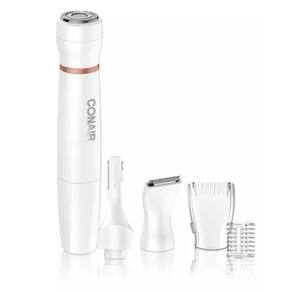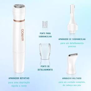 Sistema de Depilação Facial All-In-One Conair. O sistema de corte facial Satiny Smooth All-in-One da Conair remove de forma rápida e indolor os pelos indesejados do rosto ou corpo. Também pode ser para aparar áreas delicadas para resultados suaves, bonitos e sem cortes. Com lâminas hipoalergênicas para menos irritação e pode ser no chuveiro ou fora dele. Ele vem com 5 acessórios versáteis para todas as suas necessidades de depilação. O barbeador rotativo ajuda a remover pelos faciais indesejados em áreas delicadas como lábio superior, queixo ou bochechas; um aparador de cabelo multiuso proporciona um barbear rente e confortável nas pernas; axilas ou área do biquíni; aparador de sobrancelhas para modelar a sobrancelha perfeita; um pente para detalhes e outro para sobrancelhas. Este depilador tem design elegante e compacto, tornando-o perfeito para viagens ou retoques. Suave o suficiente para uso diário, inclui uma bolsa de armazenamento conveniente. Funciona sem fio e com bateria (requer 1 bateria AA, não incluída).