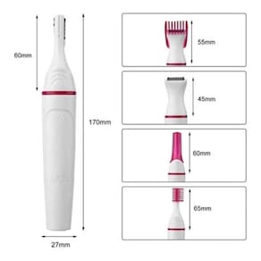 - mini depilador elétrico portátil depilação feminina 5 em 1 - o aparador permite uma maneira simples e sem dor para aparar pelos no corpo. - existem 4 aparadores removíveis que permitem aparar os pelos de diversas partes do seu corpo, incluindo coxas, axilas, costas, peito, sobrancelhas, pelo do do nariz e orelha, e área do biquíni. - um aparelho com 5 funções. - lâmina lavável, fácil de limpar. - necessita de uma pilha aa não inclusa