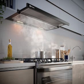 O Depurador de Ar Electrolux 90cm Retratil Preto Efficient com Luz de LED - DE9RB melhora a qualidade do ar ao mesmo tempo que se integra a sua cozinha. Seu Design Retratil e Compacto e uma solucao discreta em um produto potente e eficiente, ideal para ambientes pequenos e plantas abertas, com sala integrada. Ganhe mais flexibilidade e versatilidade de uso com a Dupla Instalacao, funcao 2 em 1 que permite sua instalacao como exaustor ou depurador.
