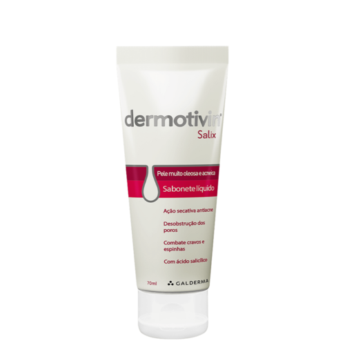 Sabonete líquido para pele muito oleosa e acneica. Dermotivin Salix possui efeito secativo, desobstrui os poros e auxilia na diminuição de cravos e espinhas.
