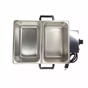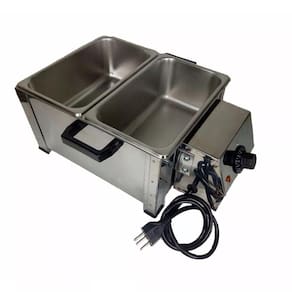 Derretedeira Industrial Inox 10 KG com 2 Cubas 5 KG Possui corpo e cuba em Aço Inox 430 que não enferruja - oxida.Possui termostato regulável permitindo que o produto esteja sempre na temperatura adequada.Aquecimento em banho-maria: Não queima e não altera o sabor e as propriedades do chocolate.Acompanha tampa em inox.Ideal para derreter e manter derretido o chocolate.Indicado para Culinaristas, Docerias, Sorveterias, Buffets em geral Hot Dog/Caldos/Sopas/Molhos/Alimentos e até para utilização em casa.Para cuidados pessoais como Derretedor de Cera Depilatória. Para terapias relaxantes como Aquecedor de Pedra. Capacidade: 2 Cubas - 5 KGConsumo: 1 kw/hTensão: 110 V Dimensões: Altura - 20 cm Largura - 40 cm Comprimento - 66 cm Marca: Ss Estufas