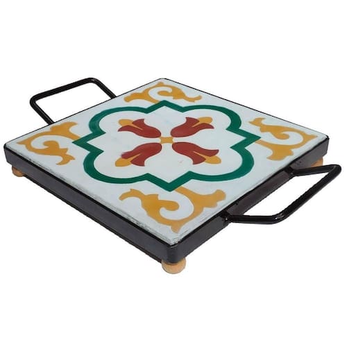 Linha em ferro com ladrilho hidráulico super estiloso e de alto requinte para servir o seu almoço. Impede que as travessas quentes danifiquem as mesas. Produto que possui alta durabilidade, totalmente leve e que proporciona praticidade e elegância na hora das refeições. Em seu superior revestido de azulejo decorado com pinturas peculiares, trazendo elegância e um estilo rústico para sua cozinha.