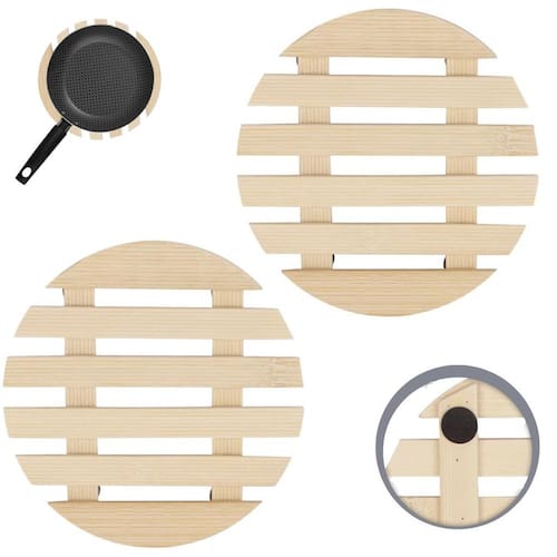 - Design ripado funcional: Permite melhor dissipação de calor e proteção das superfícies. - Madeira de alta qualidade: Material resistente e durável, com acabamento rústico e elegante. - Compacto e prático: Fácil de guardar e transportar, perfeito para uso diário.