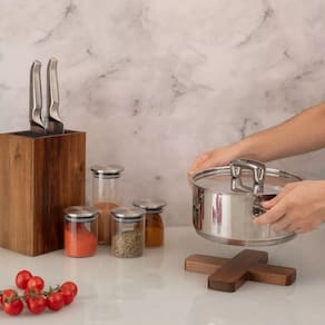 Fica bonito na mesa, na bancada ou na cozinha, deixando o ambiente mais charmoso e rústico. É de madeira acácia: durável e decorativa!