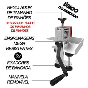 O descascador de pinhão manual com regulagem é ideal para quem precisa de um equipamento eficiente para descascar o alimento de forma rápida e prática. Além de compacto, leve e muito fácil de usar, é o único que conta com uma regulagem para você descascar todos os tamanhos de pinhão. Conta com dois fixadores de bancada para maior estabilidade e é produzido em aço zincado, garantindo maior durabilidade a máquina manual de descascar pinhão.