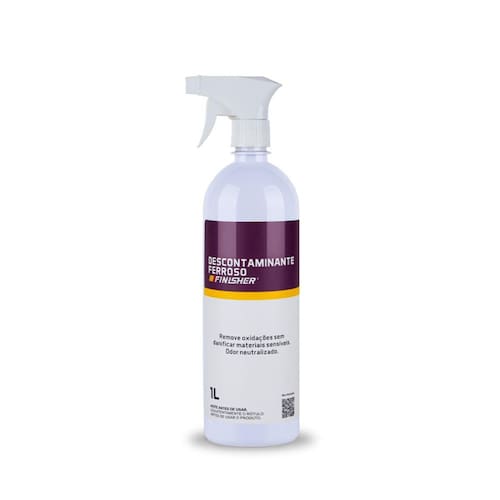 Descontaminante Ferroso 1 Litro - Finisher Produto desenvolvido para a limpeza profunda de óxidos metálicos em superfícies externas, como rodas, pinturas, vidros e outras. Possui ação desincrustante, sem danificar materiais sensíveis. Produz coloração especial ao identificar óxidos de ferro. Exclusiva tecnologia de suavização do odor característico.
