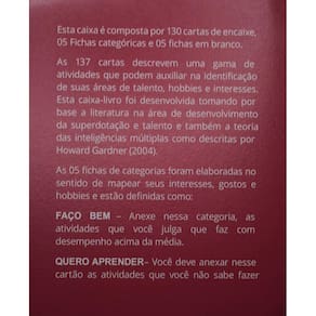 As 137 cartas descrevem uma gama de atividades que podem auxiliar na identificação de suas áreas de talento, hobbies e interesses. Esta caixa-livro foi desenvolvida tomando por base a literatura na área de desenvolvimento da superdotação e talento e também a teoria das inteligências múltiplas como descritas por Howard Gardner (2004).