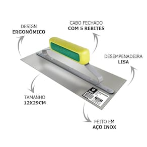 4. Qual é o tamanho da desempenadeira? A desempenadeira tem 12x29cm, um tamanho ideal para trabalhos de precisão em grandes superfícies.