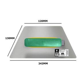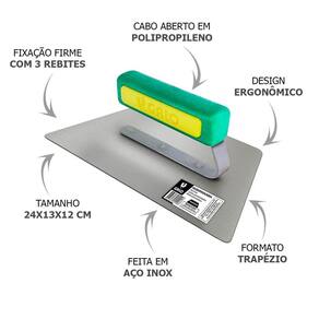 Benefícios: - Alta durabilidade com aço inoxidável resistente; - Alcance facilitado em quinas e cantos devido ao formato trapézio; - Cabo ergonômico que proporciona conforto e firmeza; - Ideal para acabamento com efeitos de massa e texturas.