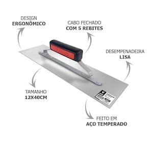 Contém: 1 desempenadeira de aço temperado 12x40cm com cabo fechado em polipropileno.