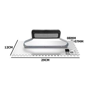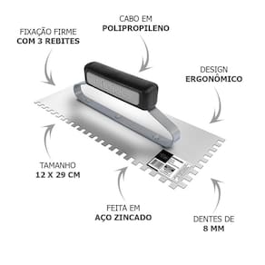 O tamanho da desempenadeira é de 12x29 cm, ideal para trabalhos em áreas médias e grandes.