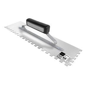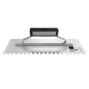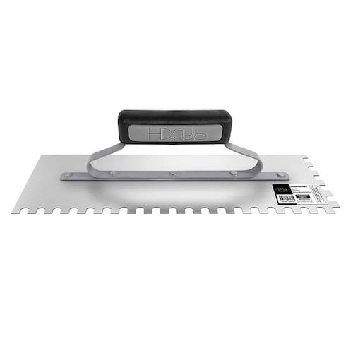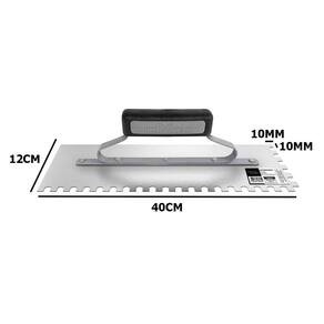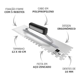 Com dentes de 10 x 10 mm, é ideal para aplicação uniforme de argamassas, possibilitando um excelente assentamento de revestimentos cerâmicos, porcelanatos, pastilhas, mármores e pedras em geral. A desempenadeira conta com uma fixação reforçada por 5 rebites, assegurando firmeza e estabilidade durante o uso. O tamanho de 12x40cm permite uma aplicação mais rápida em áreas maiores, sendo indicada especialmente para profissionais da construção, como azulejistas.