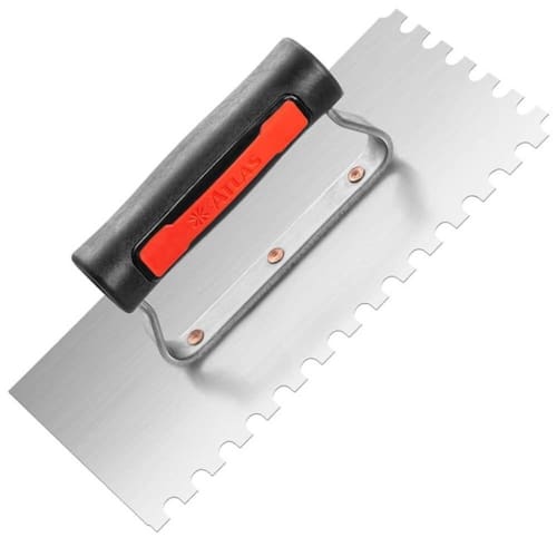 Desempenadeira de aço temperado dentada, cabo plástico com duas haste de fixação. Dentes 8mm.