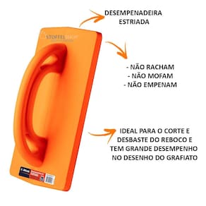 DESEMPENADEIRA POLIURETANO ESTRIADA 30X18CM REF: AT161/1MARCA: ATLAS-DESCRIÇÃO DO PRODUTO:-Desempenadeira de Poliuretano, na cor laranja, com base estriada 300mmX180mm.-Produzida em poliuretano, é uma ferramenta de alta tecnologia que apresenta desempenho e vida útil superior aos modelos de madeira, PS ou plástico reforçado com fibra de vidro.-As desempenadeiras de PU da Atlas são termo fixas e não empenam, não mofam e não racham.-São surpreendentemente leves e produzidas em monobloco, o que evita que o cabo se desprenda da base.-INDICAÇÃO DE USO:-Ideal para o corte e desbaste do reboco e tem grande desempenho no desenho do grafiato.-Indicada para a uso em argamassas em geral.-DIMENSÕES:-Comprimento: 30cm-Largura: 18cm-Altura: 8,5cmGarantia de fábrica:30 dias.