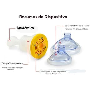 O kit inclui duas máscaras, uma para adultos e outra para crianças. Com um design fácil de usar, esse dispositivo pode ser utilizado por uma única pessoa em casos de emergência de asfixia. As máscaras vêm equipadas com capas de proteção facial para atender às diferentes necessidades de cada usuário.