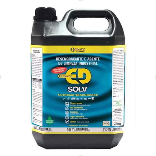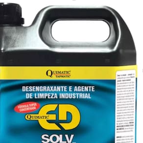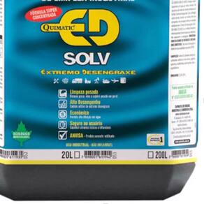 Aspecto: Líquido viscoso translúcido amarelado. Densidade a 25 ºC (g/ml): 0,95 a 1,05. PH a 25 ºC: 10 a 14. Solubilidade em água: Emulsionável. Odor: Cítrico. Capacidade: 5 Litros. Modelo: QUIMATIC ED SOLV. Marca: TAPMATIC.