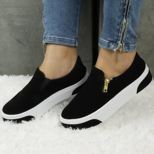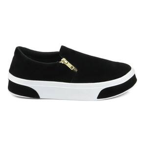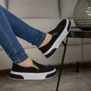 Desfile em Estilo com o Slip On Feminino em Camurça e Solado Com Tiras Preto - 34 - Preto