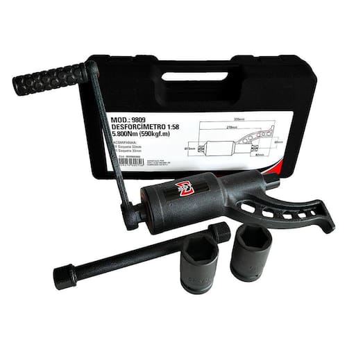 Características: • Facilita a desmontagem de rodas de ônibus e caminhões; • Multiplica o torque; • Reduz o esforço; • Acompanha maleta plástica com 2 soquetes de impacto (32 e 33mm).