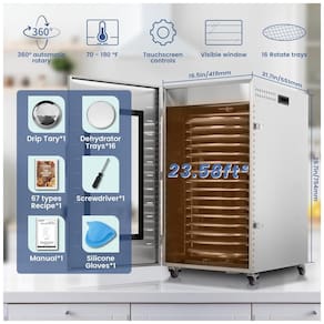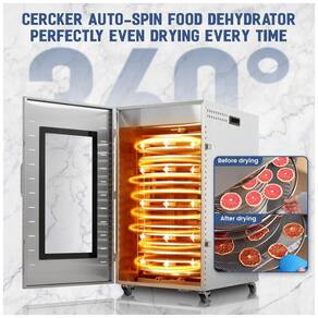 Este desidratador de alimentos comercial possui uma tecnologia exclusiva de rotação automática 360, que melhora a eficiência de secagem. A rotação uniforme em todas as direções evita secagem parcial e torna a produção mais livre de preocupações. O corpo do chassi integrado é feito de aço inoxidável 100 de qualidade alimentar, com prevenção de ferrugem, resistência ao desgaste e resistência ao fogo. A bandeja do desidratador é feita de material de aço inoxidável 304, permitindo o contato direto com ingredientes alimentares. Com capacidade de 5,62 metros e 16 bandejas, é ideal para desidratação de carne seca, carne bovina, frutas, carne, ervas, etc. O design de frequência variável de motor duplo economiza energia e possui alta eficiência e longa vida útil. Possui um temporizador de 900 minutos e controle de temperatura inteligente, sem necessidade de supervisão manual. A proteção contra superaquecimento é ativada caso a temperatura atinja 120 graus. Equipado com excelentes rodas universais e alças duplas fixas em ambos os lados para fácil movimentação. A maçaneta da porta apresenta um design suave, proporcionando excelente sensação tátil.