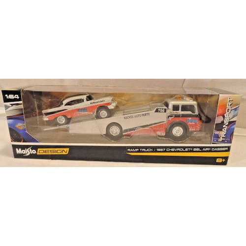 NOVO PARA 2018 CHEVY GASSER 1957 PRATEADO E VERMELHO COM CAMINHÃO DE RAMPA. DIFÍCIL DE ENCONTRAR NAS LOJAS. ESCALA 1:64 -