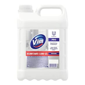 Vim Cloro Gel 5L é um poderoso detergente desinfetante clorado que mata os diversos tipos de germes conhecidos: bactérias, vírus e fungos. Pode ser utilizado no banheiro, cozinha e pisos frios. Oferece maior controle na aplicação e poder de limpeza devido à sua consistência em gel. Vim Cloro Gel limpa e destrói germes, bactérias e vírus: sua fórmula com hipoclorito + detergente promove uma eficiente limpeza e desinfecção. Além de uma excelente ação antimicrobiana, o hipoclorito auxilia o detergente alcalino na limpeza, cortando as moléculas de sujeira em pedaços menores que são mais facilmente removidos. Cuidados com a aplicação: Antes da aplicação do Cloro Gel Vim, recomendamos que o produto seja testado em uma pequena área não visível. Não misturar com outros produtos. A mistura com ácidos, produtos à base de amônia ou detergentes produz gases tóxicos. Enxaguar com água em abundância as superfícies que tenham contato com alimentos. Evitar o contato do Vim Cloro Gel 5 Litros com roupas, tapetes, estofados e madeiras (inclusive as pintadas). Não aplicar o Cloro em Gel Vim sobre superfícies metálicas, linóleos e/ou superfícies danificadas ou velhas. Em superfícies vinílicas, utilizar o Vim Cloro em Gel diluído. Não aplicar sobre superfícies aquecidas. Não utilizar para desinfecção de alimentos e água para consumo humano. Cuidados de conservação: Conservar a embalagem fechada em lugar fresco, ao abrigo de luz solar direta e do calor. Devem ser evitadas temperaturas extremas. Nunca misture produtos químicos ao Vim Cloro Gel 5L, a menos que tal procedimento seja indicado pelo fabricante por escrito.