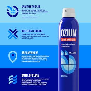 - Limpa o ar que você respira: Ozium higieniza e desodoriza o ar, reduzindo temporariamente bactérias e germes que causam odores desagradáveis, deixando o ar com cheiro fresco